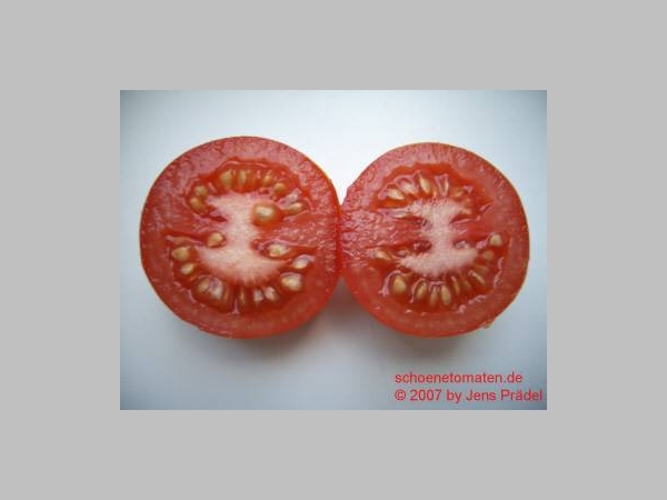 schöne, mittelgroße, durchschnittlich 50 g schwere, leicht breitrunde, rote Früchte mit 2 Fruchtkammern