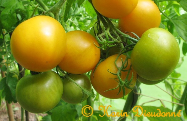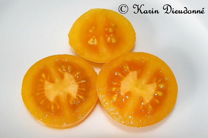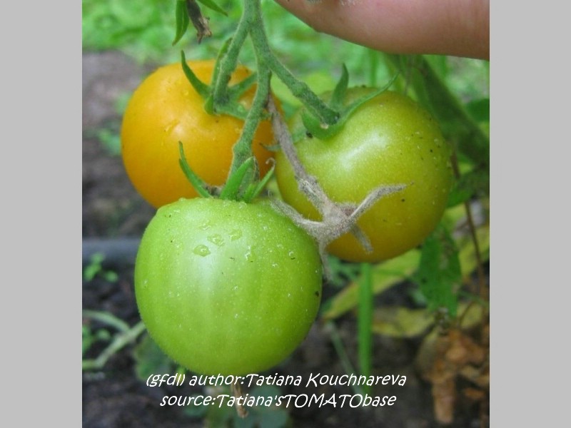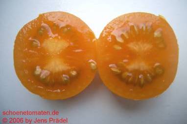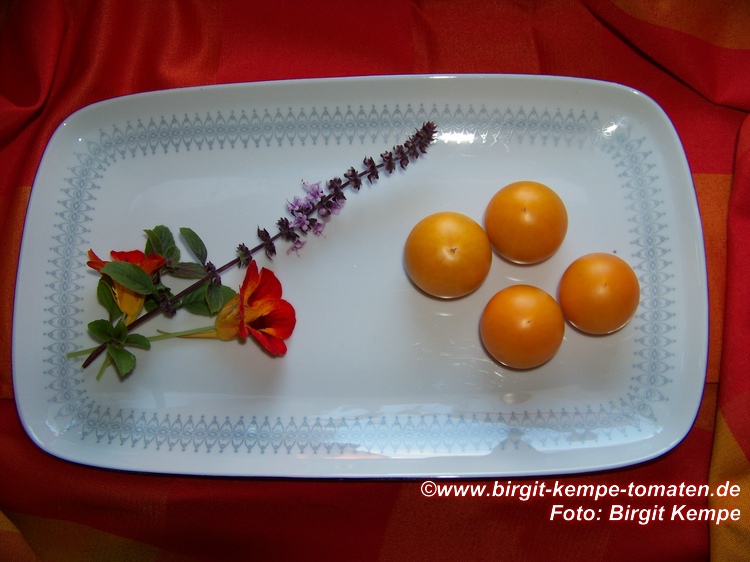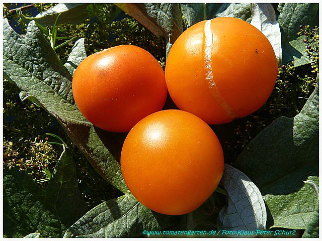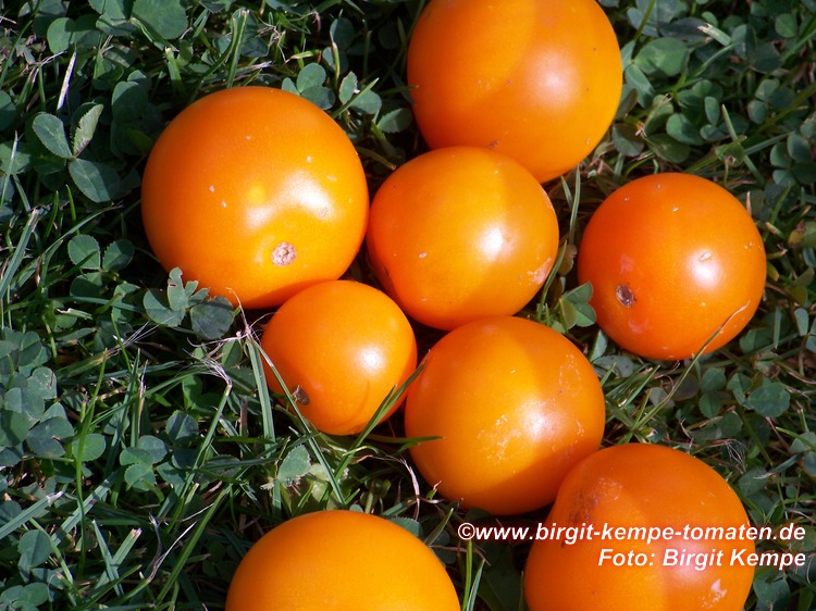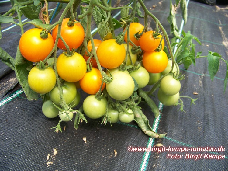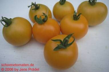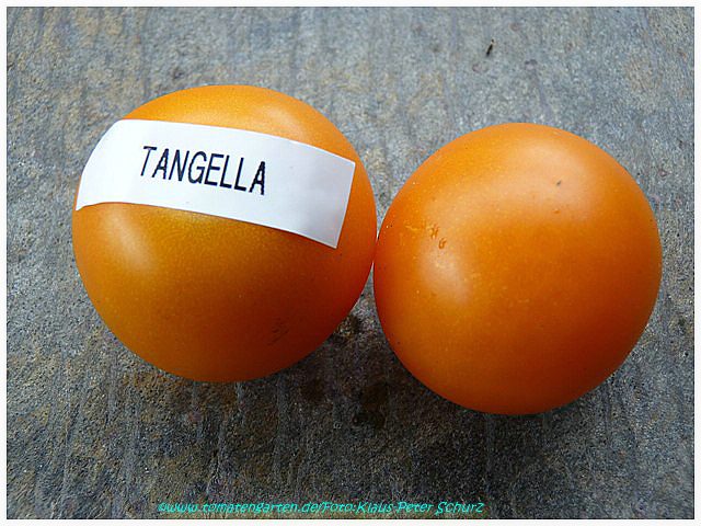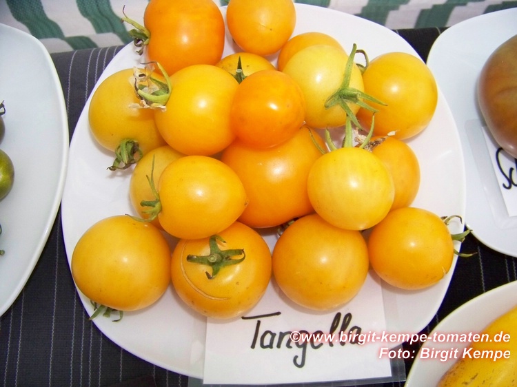 Tangella - mittelgroße (1,5 bis 2 m) Pflanze früher Erntebeginn (Anfang August) ordentlicher Ertrag kleine (ø ca. 4 cm und 30 bis 40 g schwer), gleichmäßig runde, dunkelgelbe bis orangefarbene Früchte schöne mildsaftig schmeckende Sorte (Quelle: www.schoenetomaten.de)