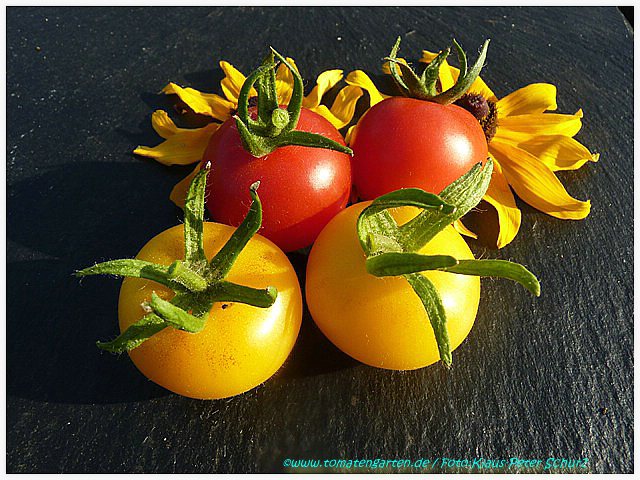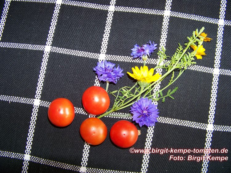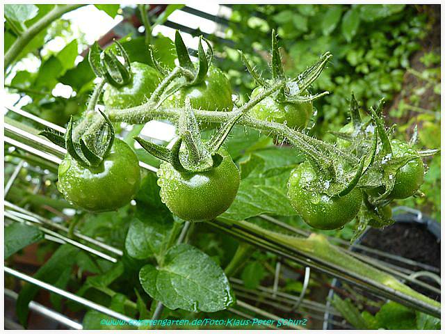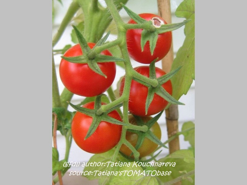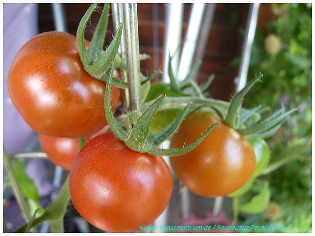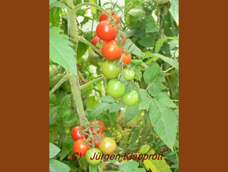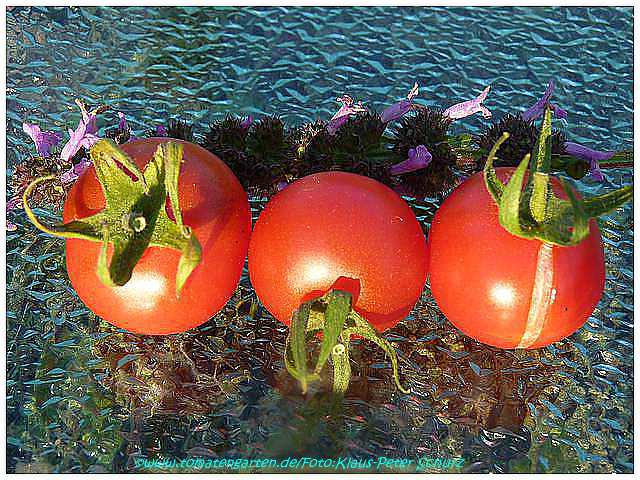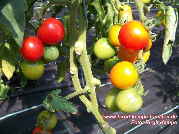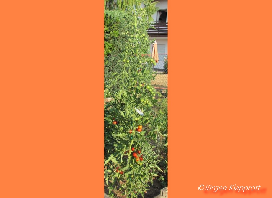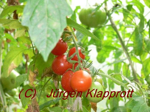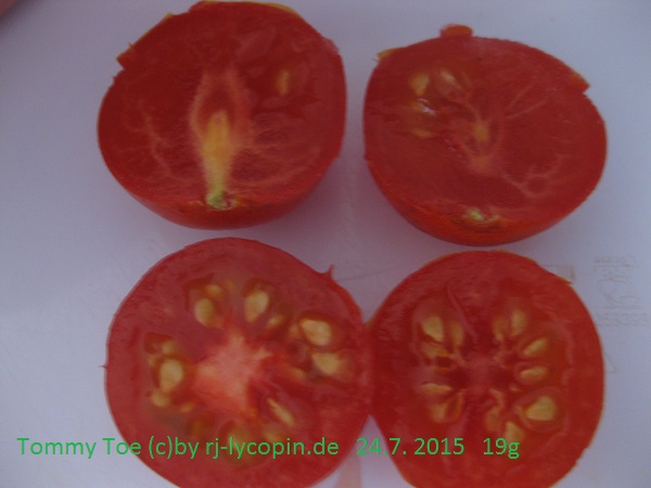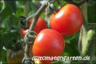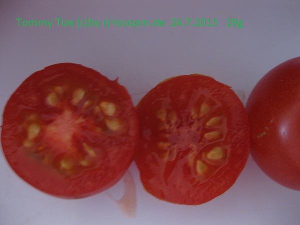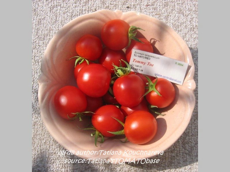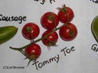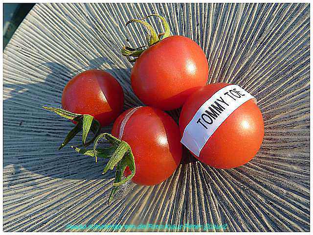 Tommy Toe - sehr große Pflanze (bis 3 m) sehr früher Erntebeginn (Ende Juli) reicher, lang anhaltender Ertrag kleine (ø 3 bis 4 cm), rote, runde Früchte viele Rispen sehr schöner, leicht süßlicher Geschmack (Quelle: www.schoenetomaten.de)