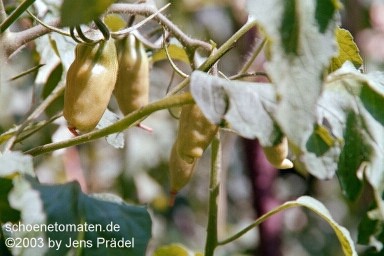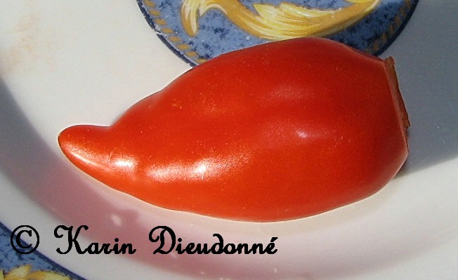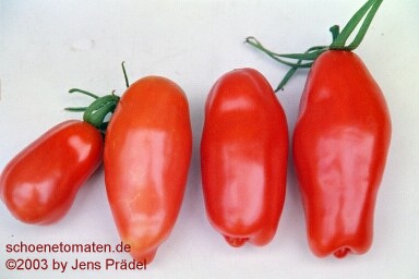 Tegucigalpa - sehr große Pflanze (bis 2,5 m) später Erntebeginn (Mitte August) guter Ertrag länglich-ovale, rote Früchte mit Spitze nicht sehr saftig, ideal für Soßen (Besonderheit beim eigenen Anbau: Früchte teilweise schwarze Stellen am Blütenrest) (Quelle: www.schoenetomaten.de)