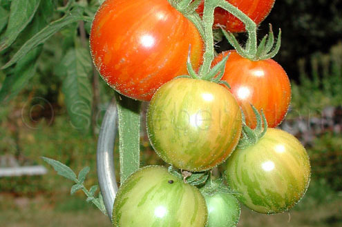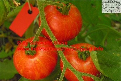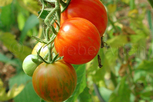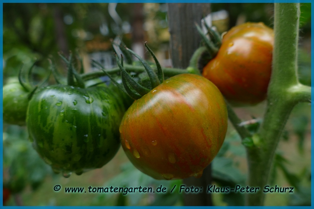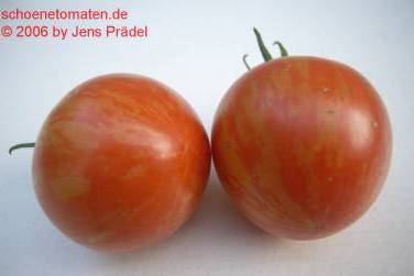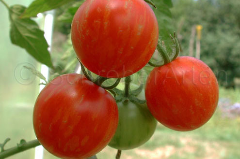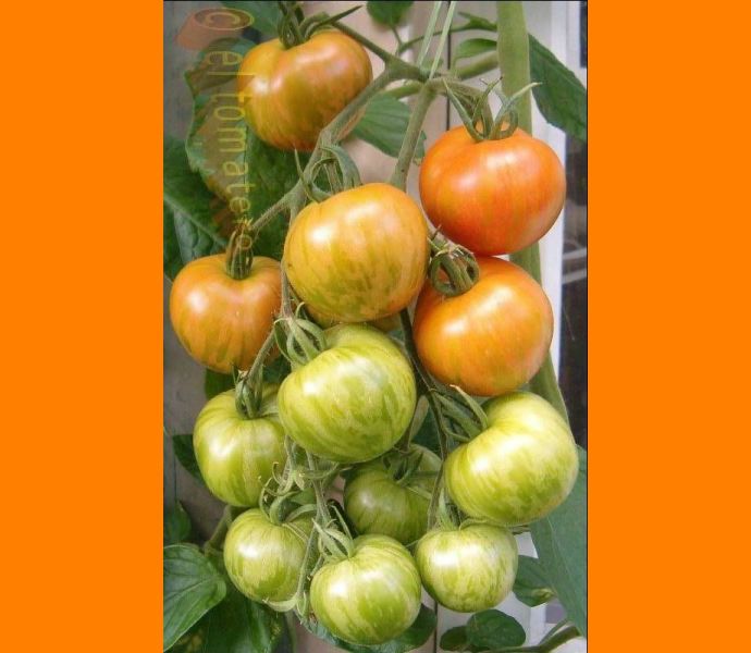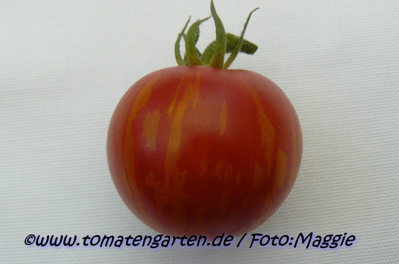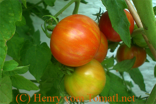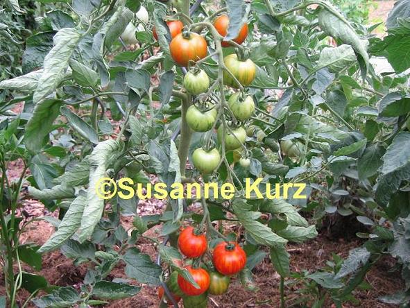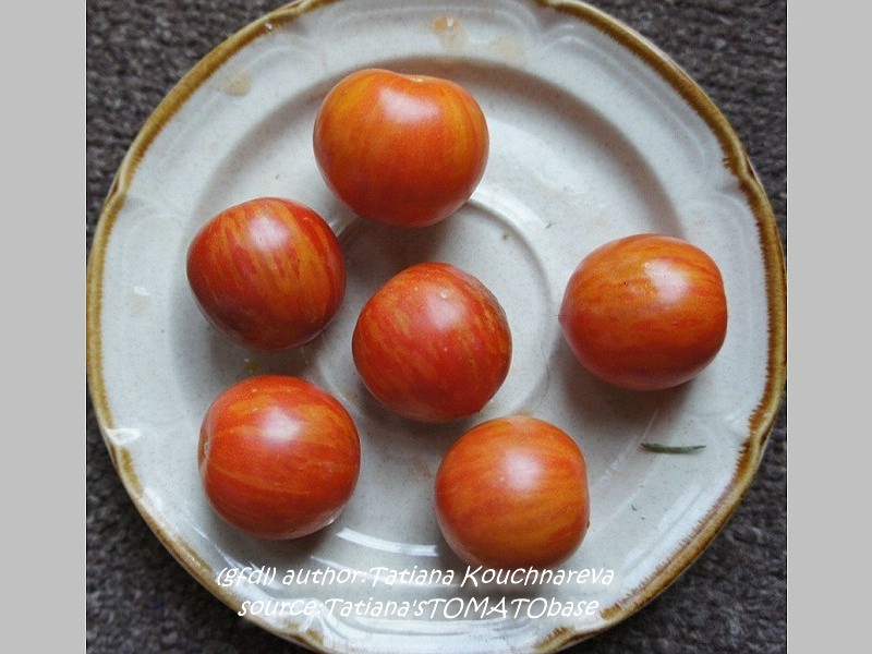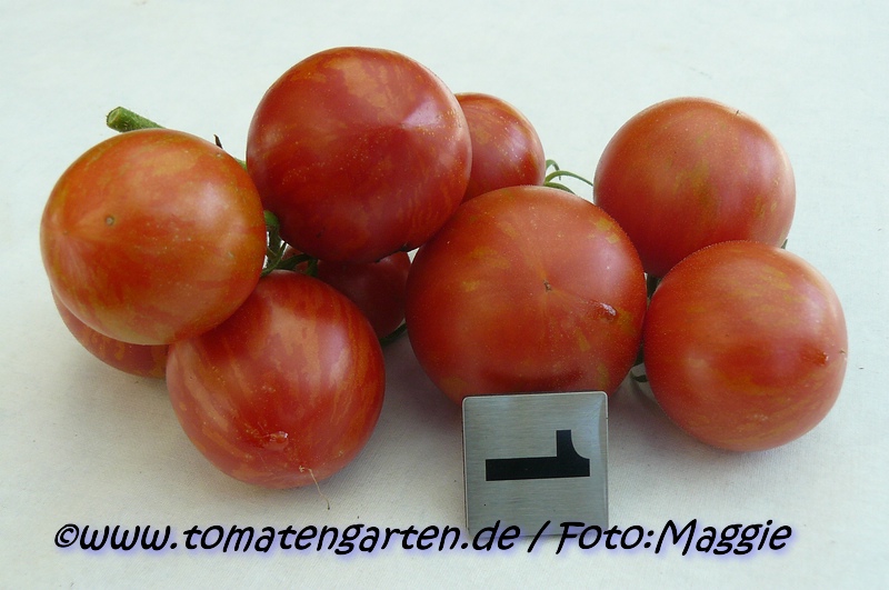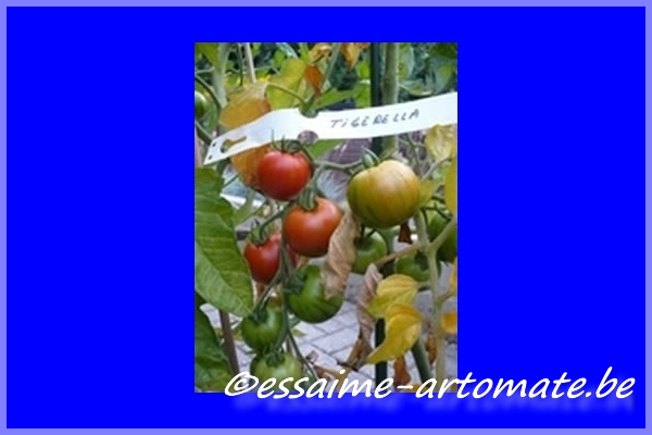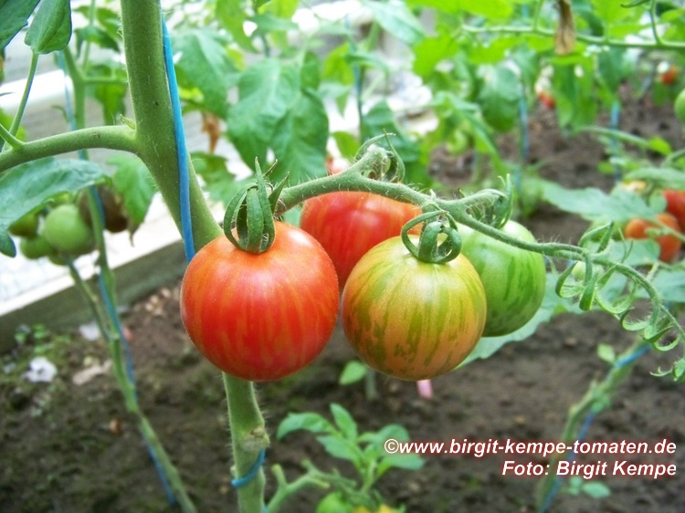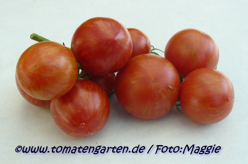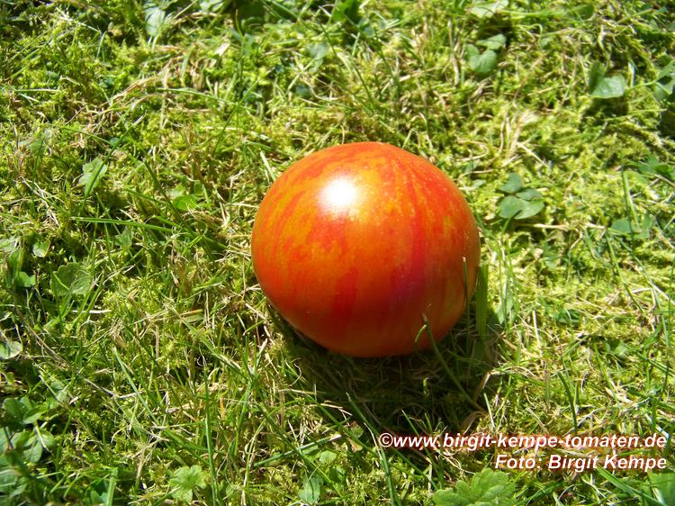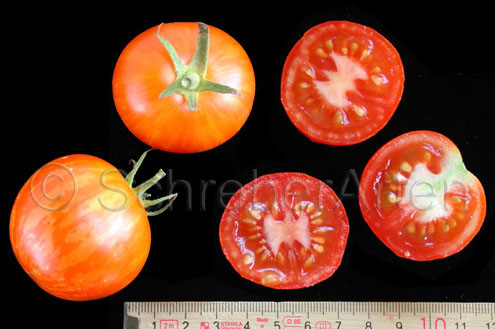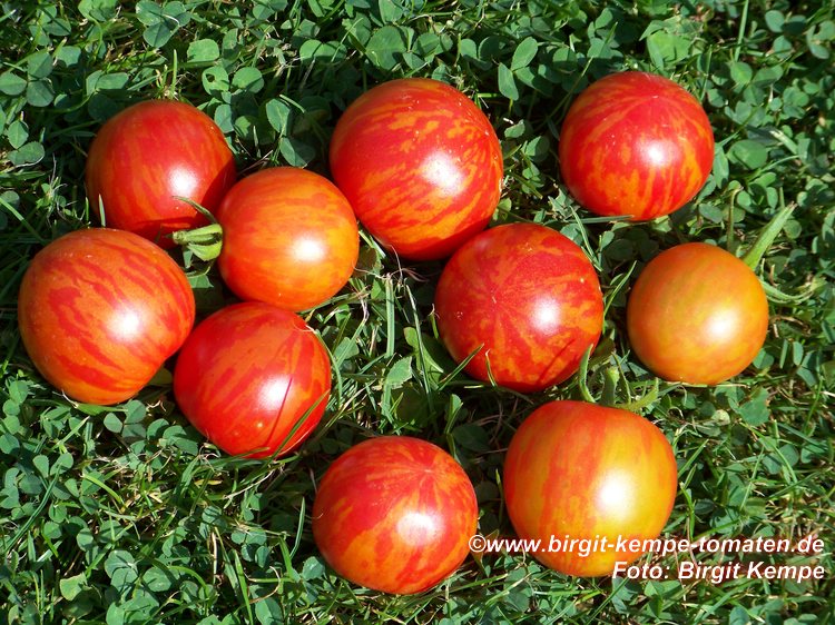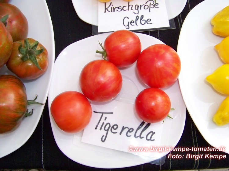 Tigerella - mittelgroße (1,5 bis 2 m) Pflanze mittelfrüher Erntebeginn (Mitte August) nicht sehr ertragreich kleine (ø ca. 4 bis 5 cm und 50 bis 60 g), runde, orangerote Früchte mit zunächst grünen, dann bei Vollreife orangefarbenen und damit nicht mehr deutlich sichtbaren Streifen angenehmer Geschmack eine attraktive Sorte (Quelle: www.schoenetomaten.de)