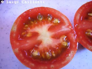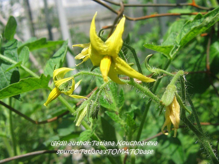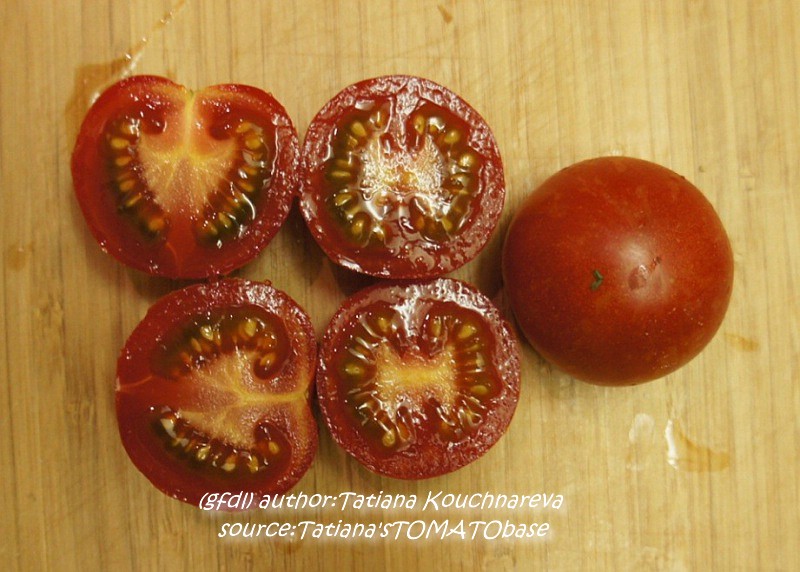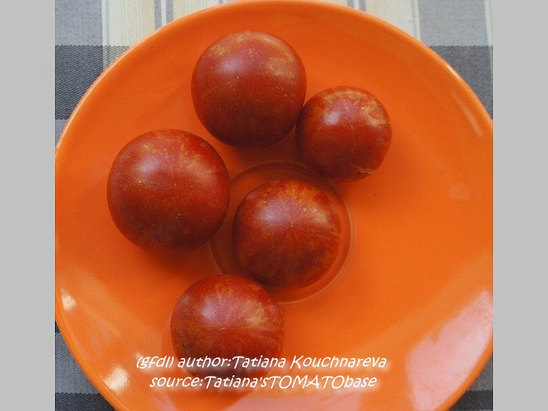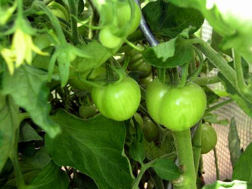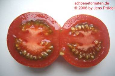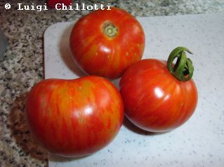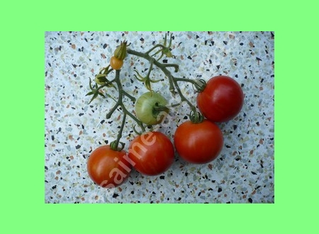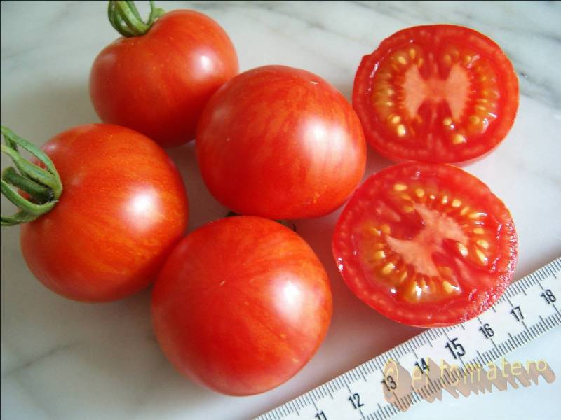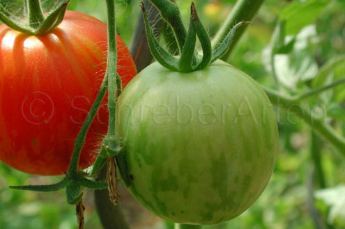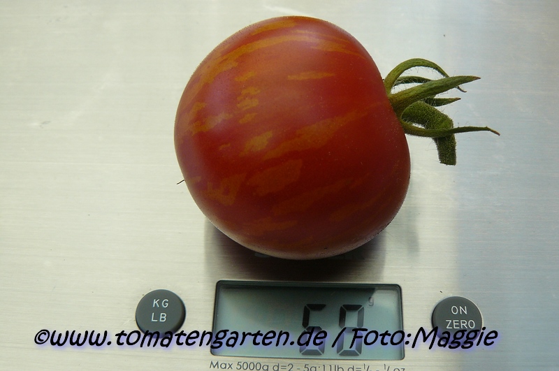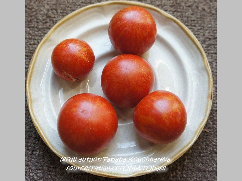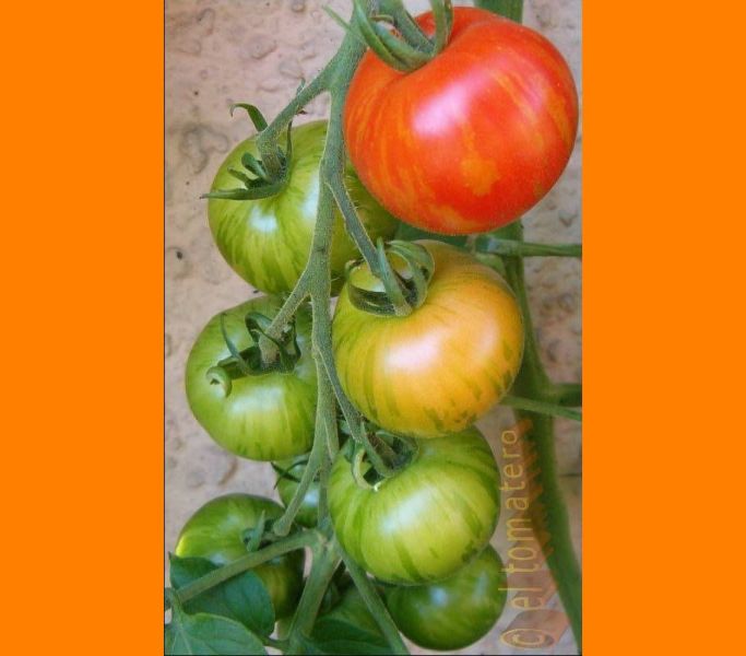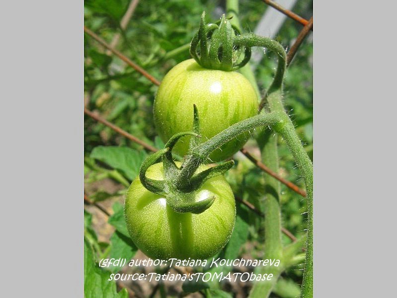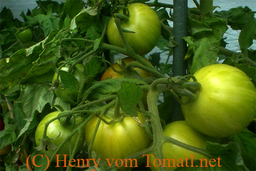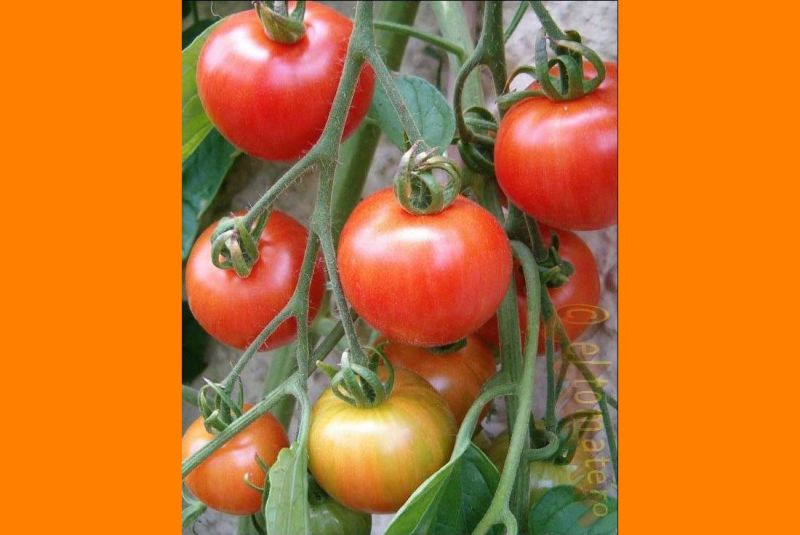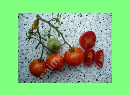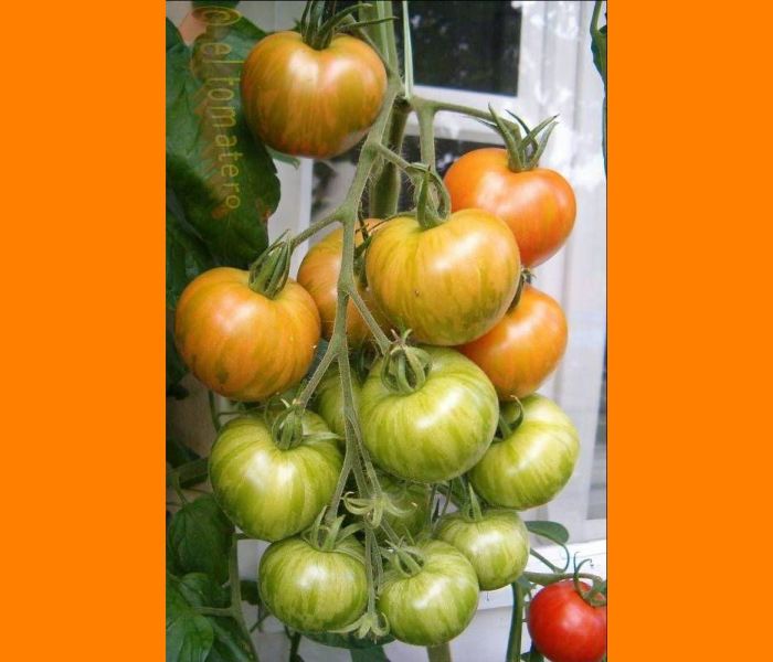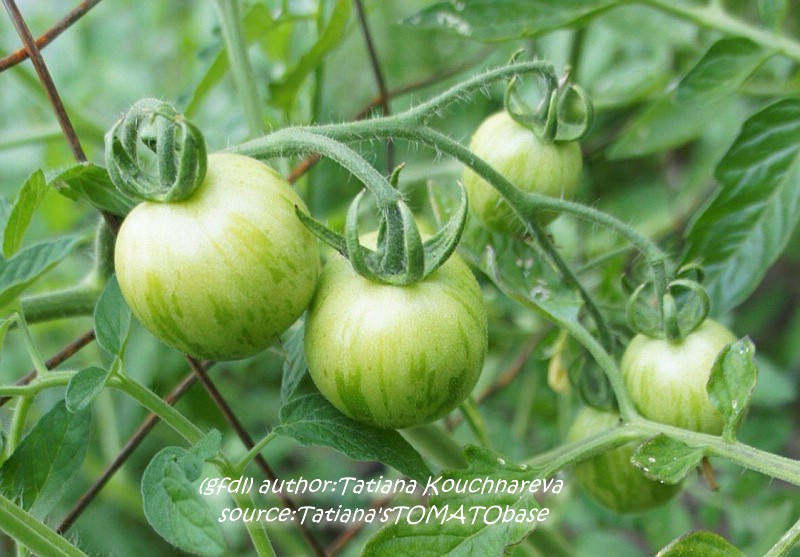 Tigerella - mittelgroße (1,5 bis 2 m) Pflanze mittelfrüher Erntebeginn (Mitte August) nicht sehr ertragreich kleine (ø ca. 4 bis 5 cm und 50 bis 60 g), runde, orangerote Früchte mit zunächst grünen, dann bei Vollreife orangefarbenen und damit nicht mehr deutlich sichtbaren Streifen angenehmer Geschmack eine attraktive Sorte (Quelle: www.schoenetomaten.de)