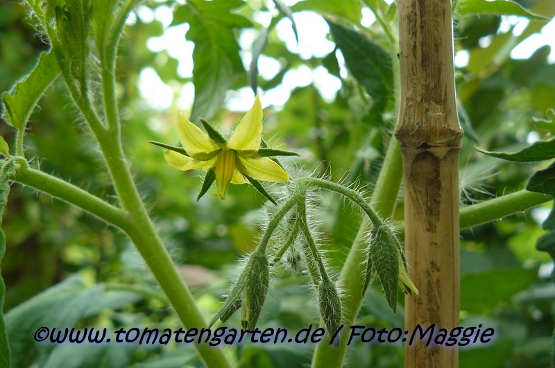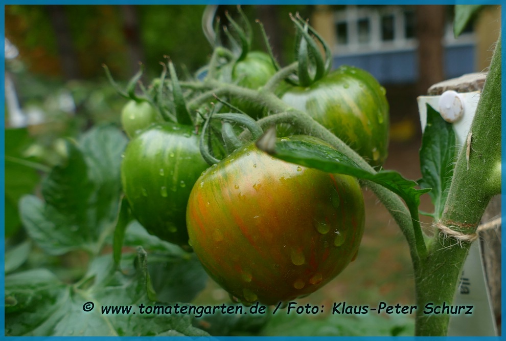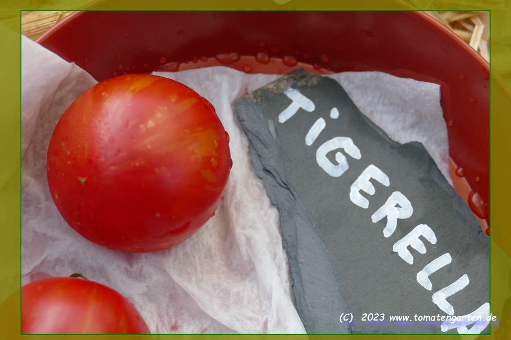 Im heißen Sommer 2022 hat sich die Tigerella über die Komposterde im sonnigen Gemüsebeet selbst ausgesät. Es entstanden sehr robuste gesunde Pflanzen, die ich wild wachsen ließ. Der Ertrag wäre wirklich gut gewesen, hätten die oft am Boden liegenden Früchte nicht auch den Schnecken so gut geschmeckt. Der Geschmack der Freilandtomaten war besser als der 2021 im Gewächshaus gezogenen.