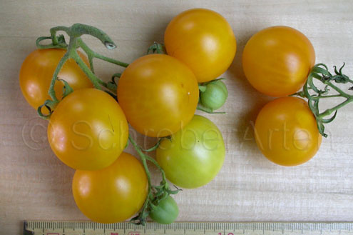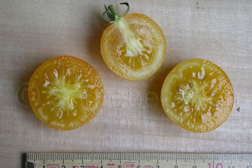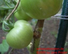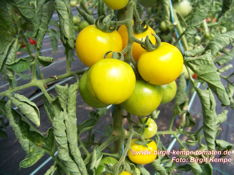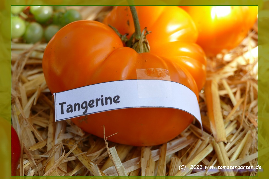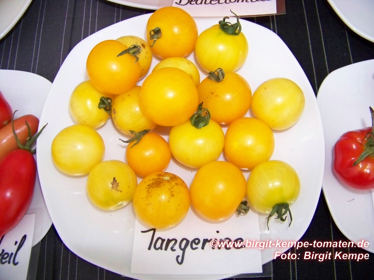 Tangerine - bei mir kleine Pflanze (bis 1,5 m) (keine idealen Jungpflanzen; sonst wahrscheinlich größer) sehr später Erntebeginn (Anfang September) geringer Ertrag kleine (50 bis 70 g), runde, dunkelgelbe bis orangefarbene Früchte süßsaftiger Geschmack starker Braunfäulebefall (Quelle: www.schoenetomaten.de)