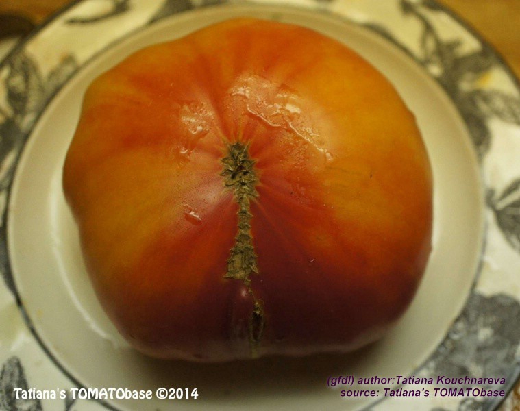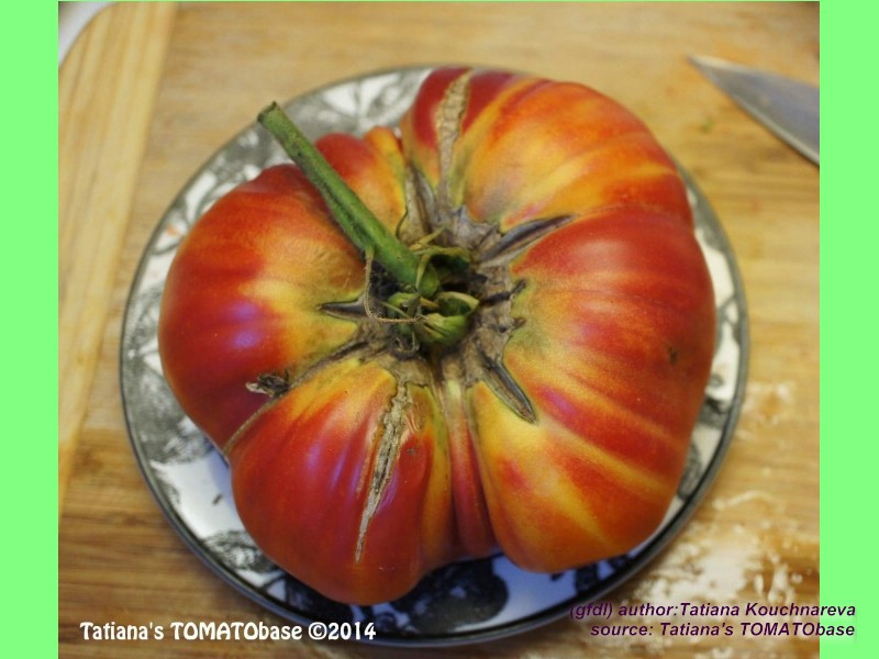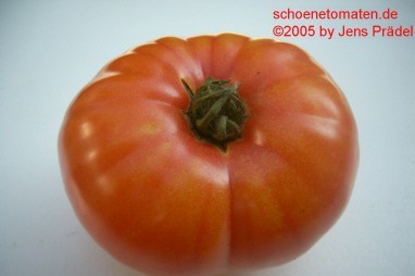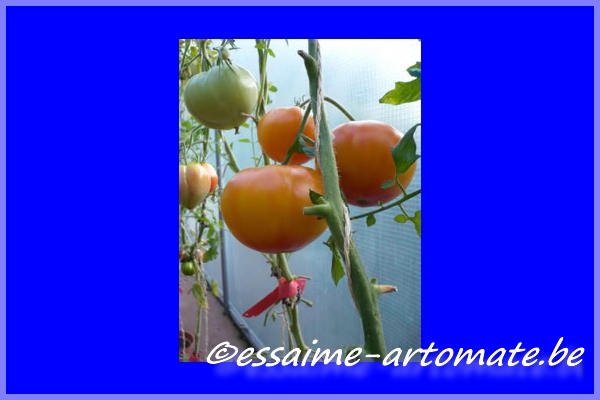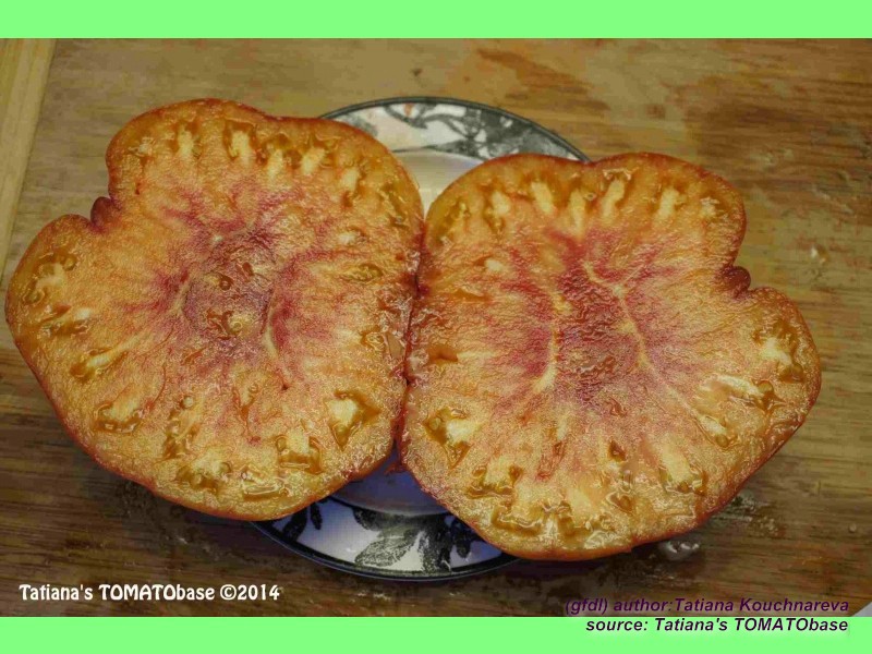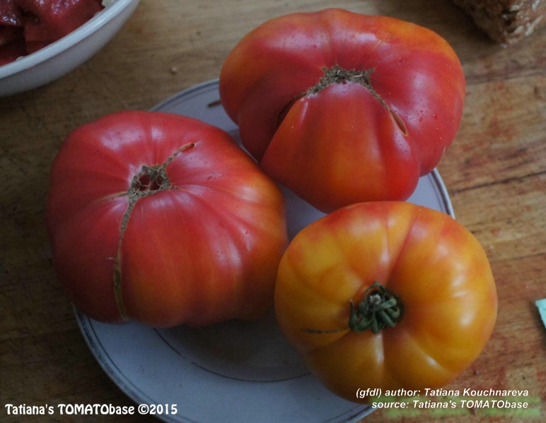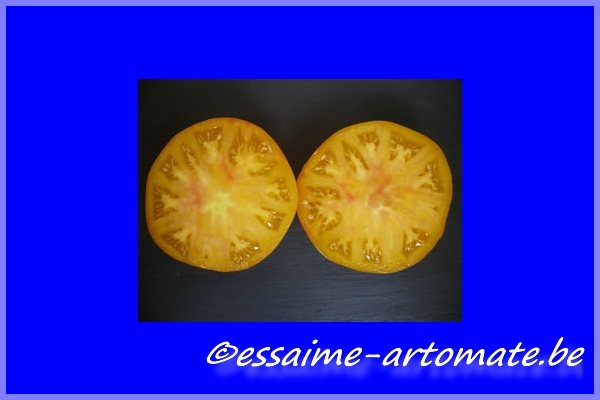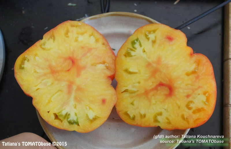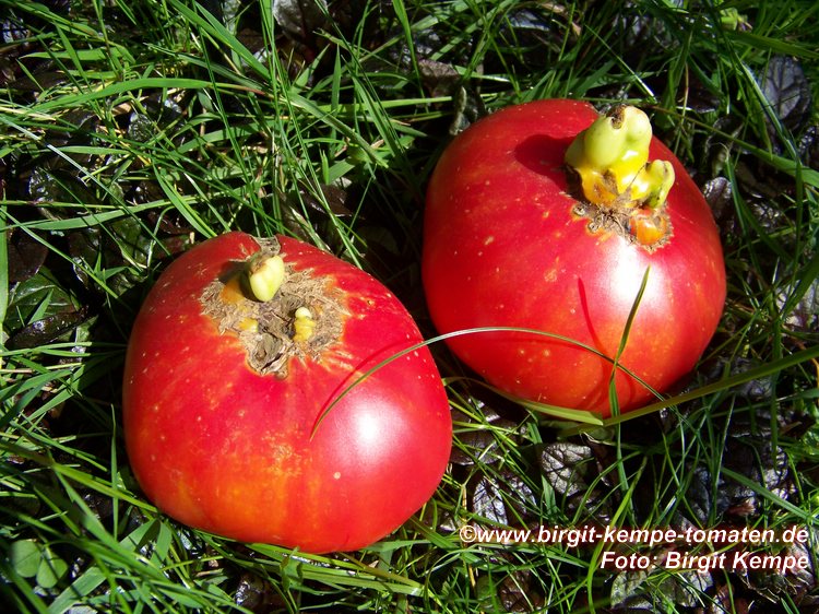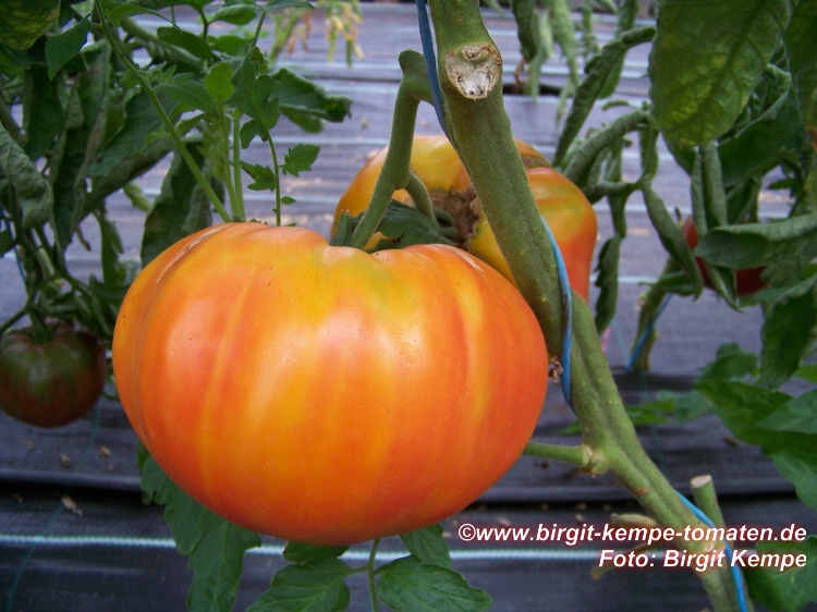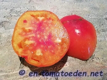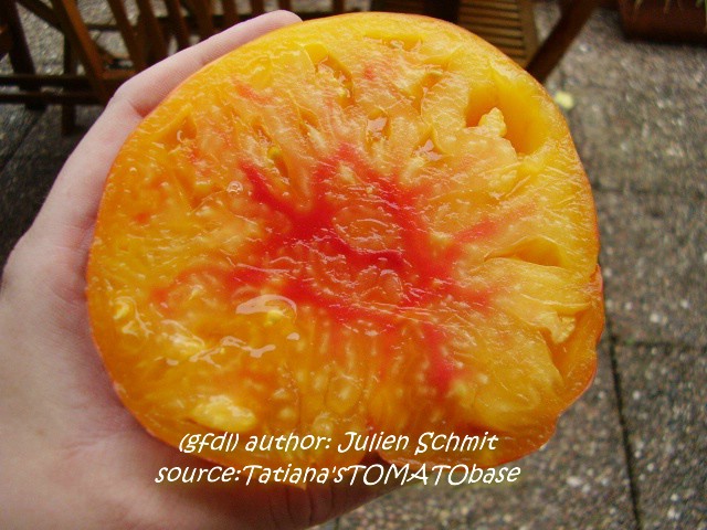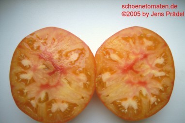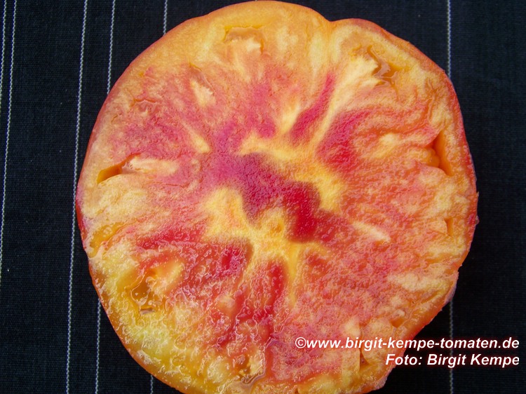 Tuxhorn's Red and Yellow - kleine Pflanze (bis 1,5 m) extrem später Erntebeginn (Mitte September) reicher Ertrag sehr große (250 bis 400 g), runde, nur leicht gerippte, gelb-orange bis zu rote (bei Vollreife) Früchte innen gelb-orange mit roten Stellen im Zentrum größte geerntete Frucht: 387 g süßsaftiger leckerer Geschmack (Quelle: www.schoenetomaten.de)