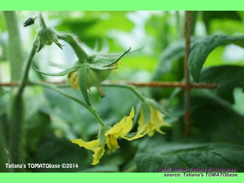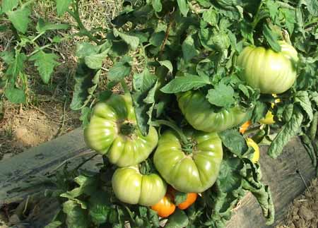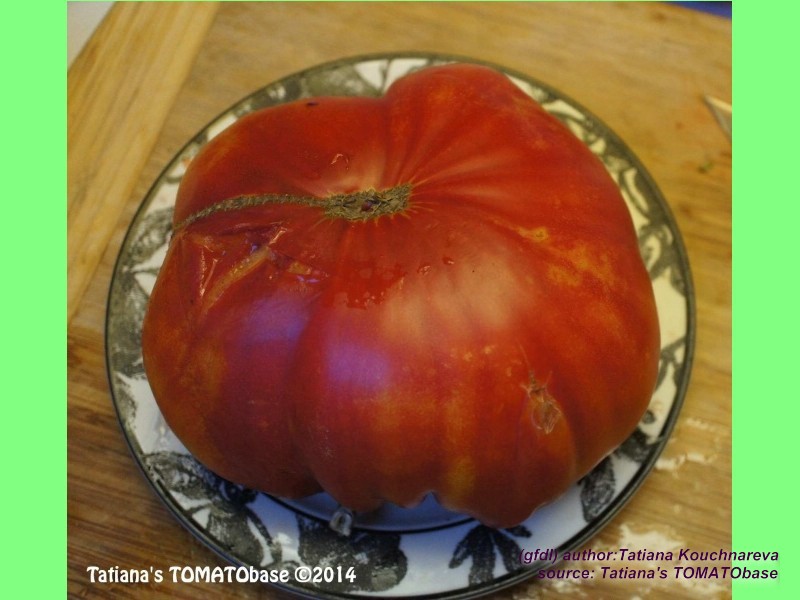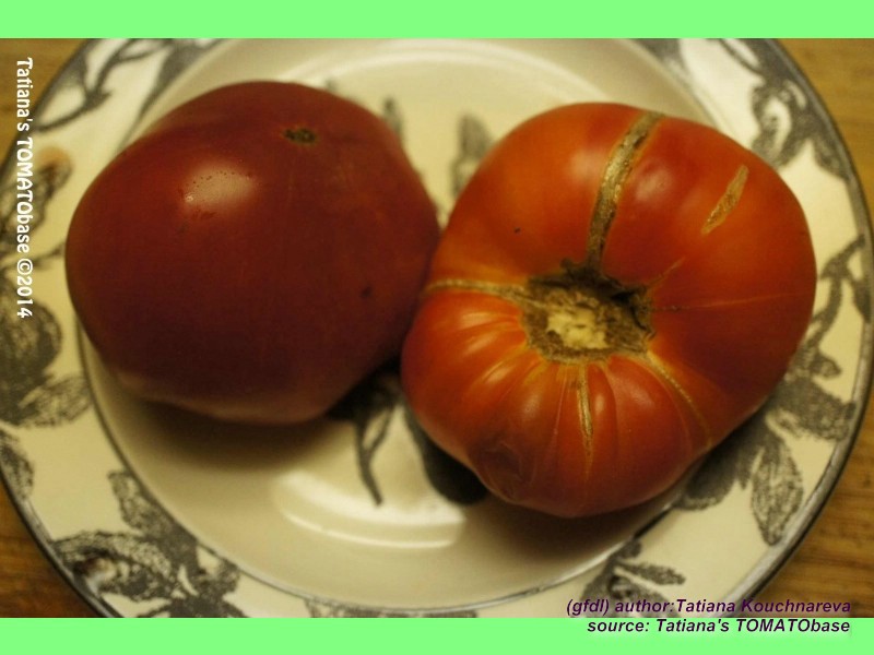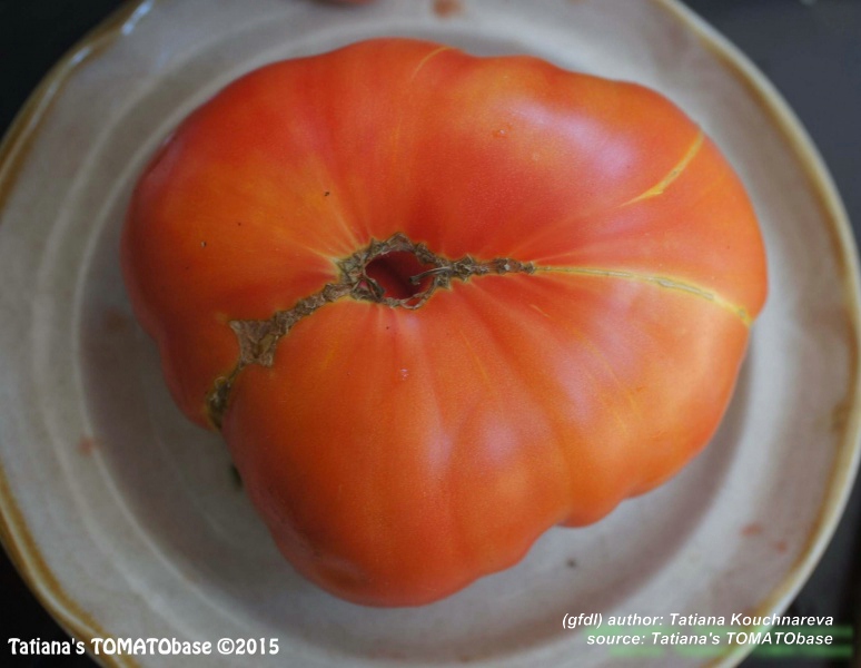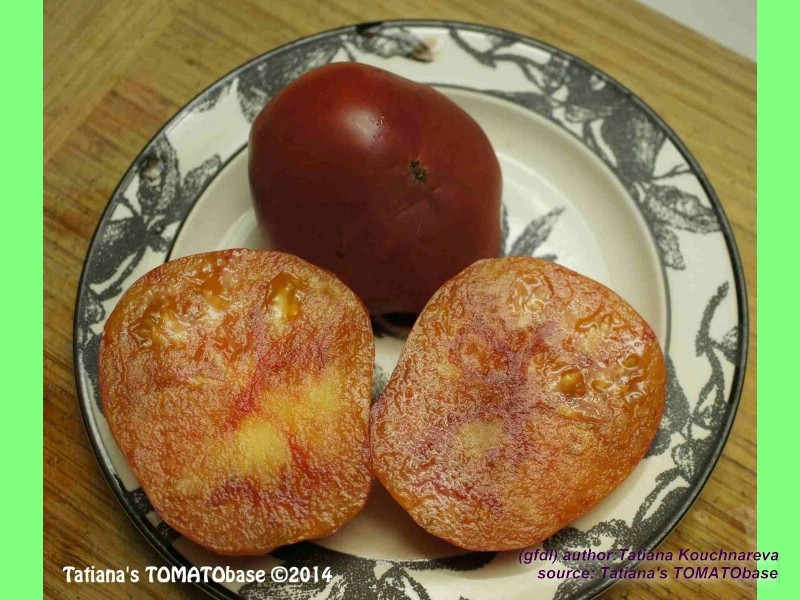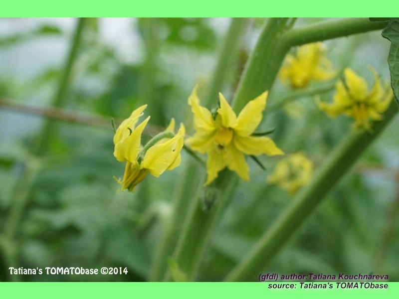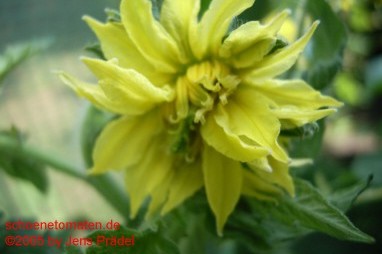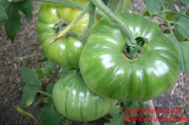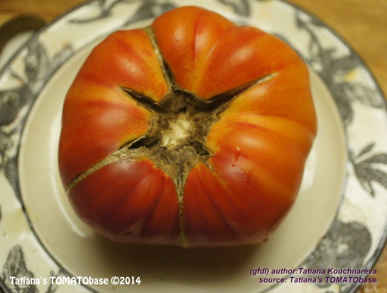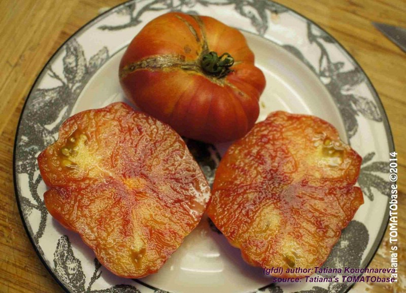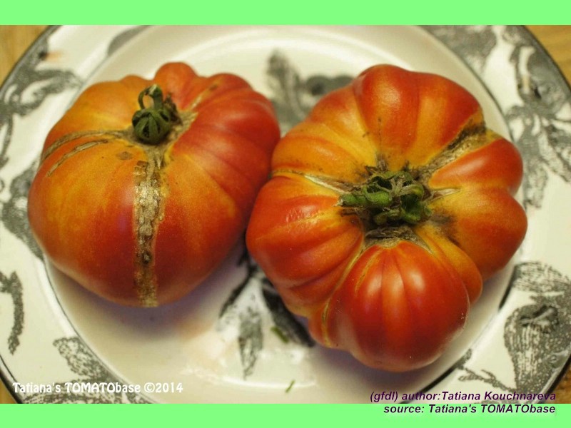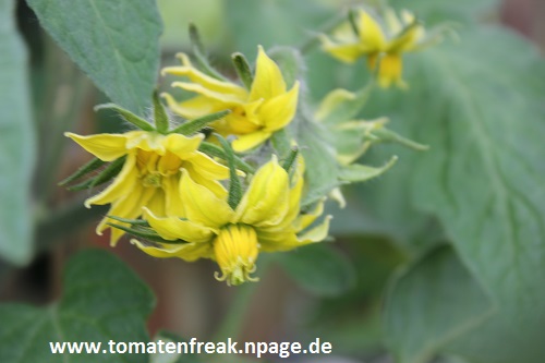 Tuxhorn's Red and Yellow - kleine Pflanze (bis 1,5 m) extrem später Erntebeginn (Mitte September) reicher Ertrag sehr große (250 bis 400 g), runde, nur leicht gerippte, gelb-orange bis zu rote (bei Vollreife) Früchte innen gelb-orange mit roten Stellen im Zentrum größte geerntete Frucht: 387 g süßsaftiger leckerer Geschmack (Quelle: www.schoenetomaten.de)
