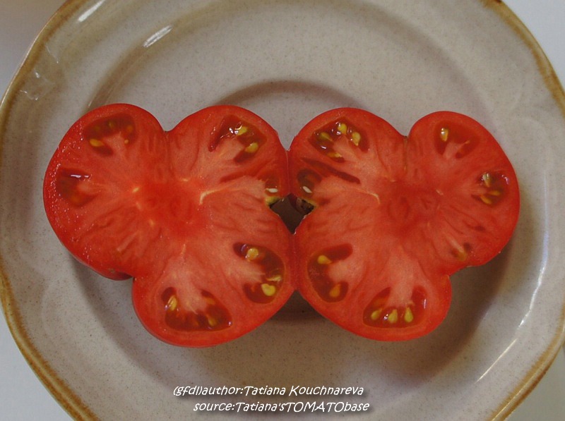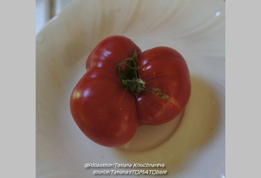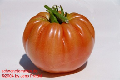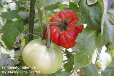Taps - sehr große Pflanze (bis 3 m) früher Erntebeginn (Anfang August) reich tragend sehr große, breitrunde, oben stark gerippte, rote Früchte schöner Tomatengeschmack, saftig schwerste geerntete Frucht: 571 g der Form und Größe nach eher eine Fleischtomate (Quelle: www.schoenetomaten.de)