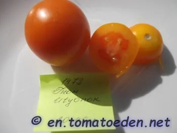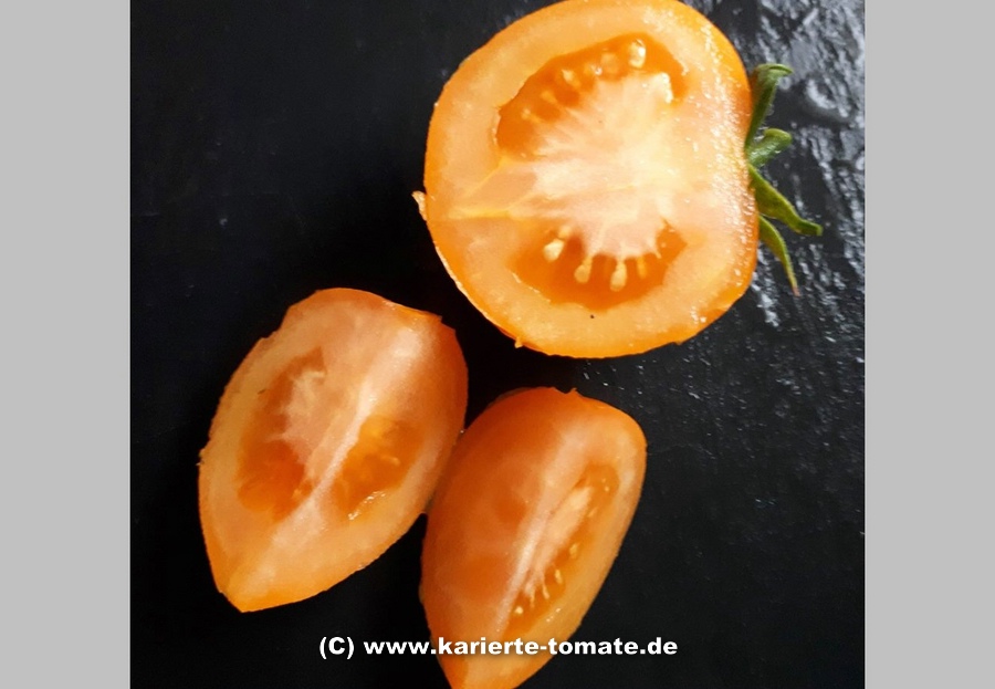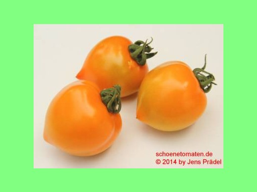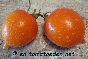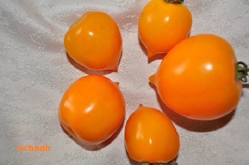 kleine bis mittelgroße, runde (ø 4 bis 5 cm), 30 bis 60 g schwere, orange-rote bis lachsfarbene Früchte mit einer kreiselförmigen Spitze