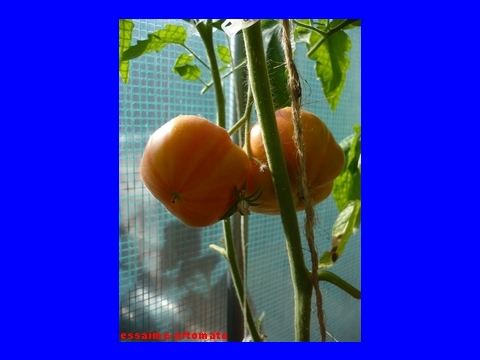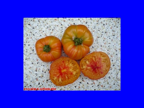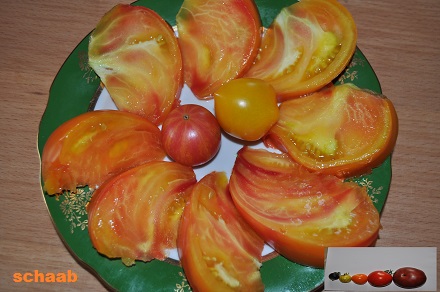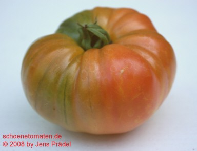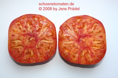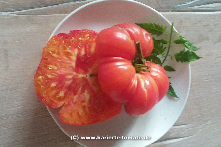 mittelgroße, breitrunde, glatte, orange-rote Früchte mit attraktiv orange-rot marmorisiertem Fruchtfleisch