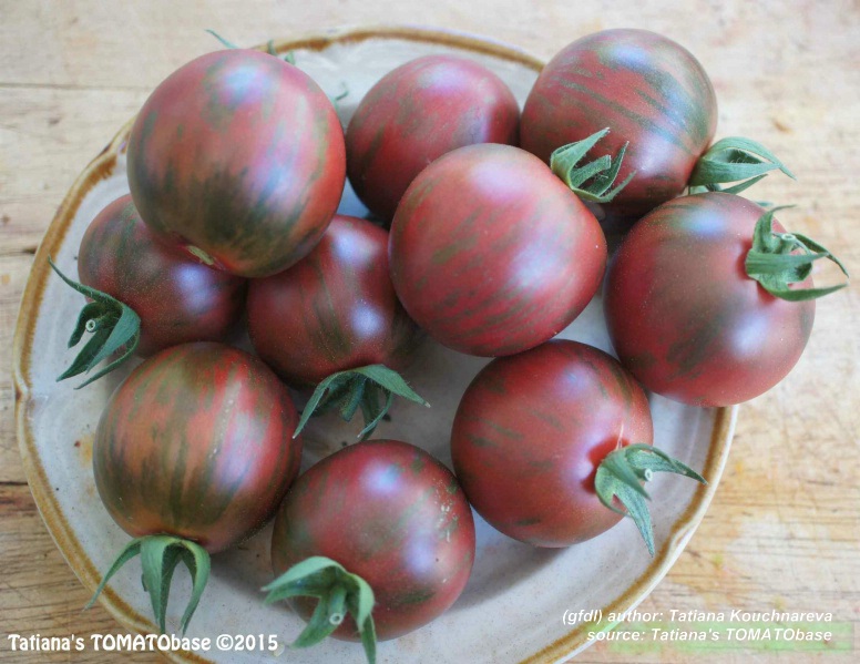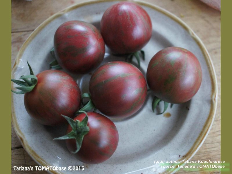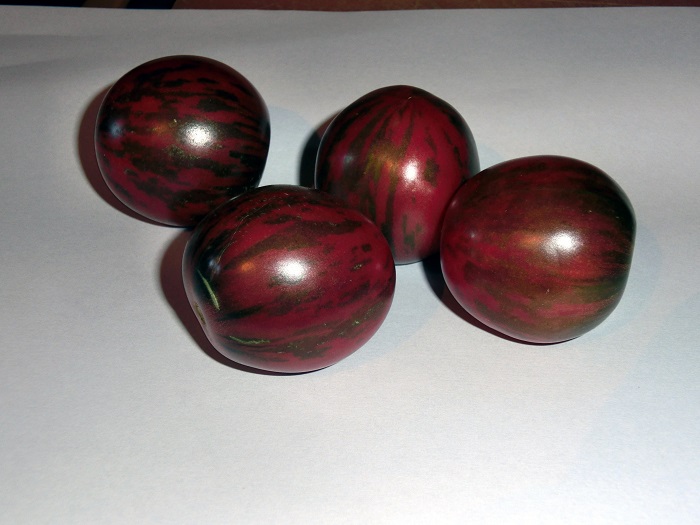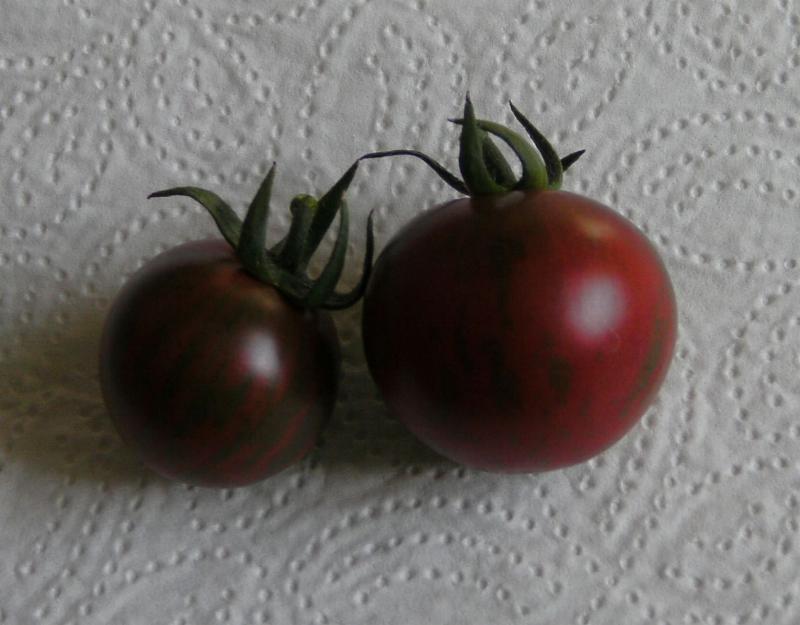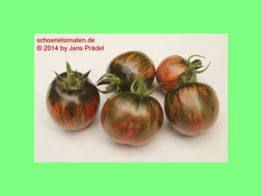 kleine (ø ca. 4 cm), 20 bis 30 g schwere, runde, olivgrün-dunkelrot gestreifte und gefleckte Früchte