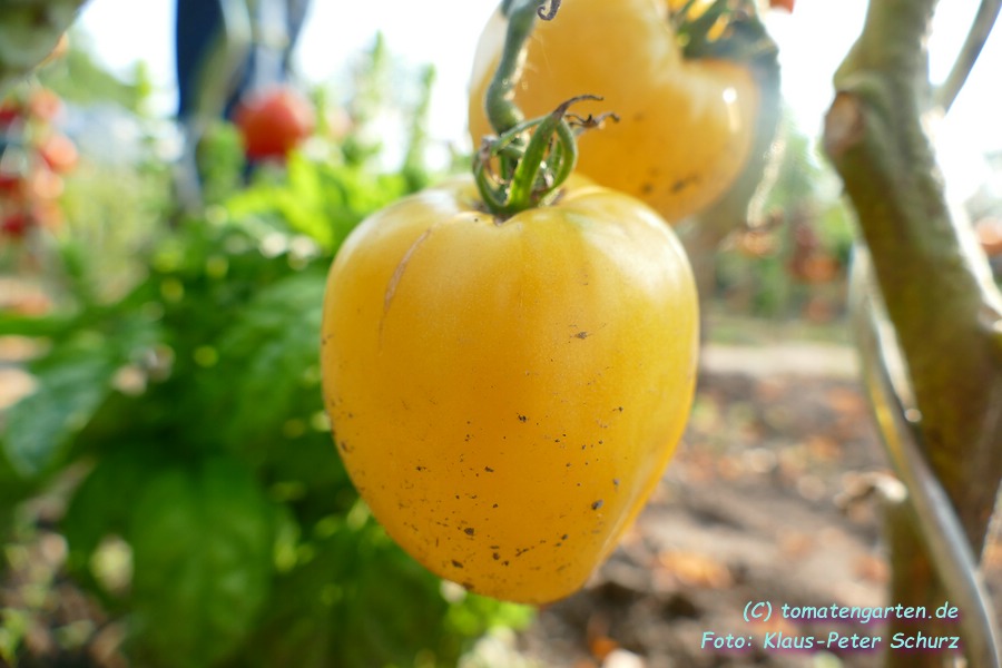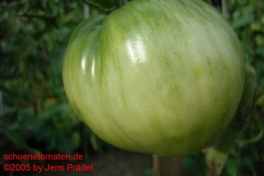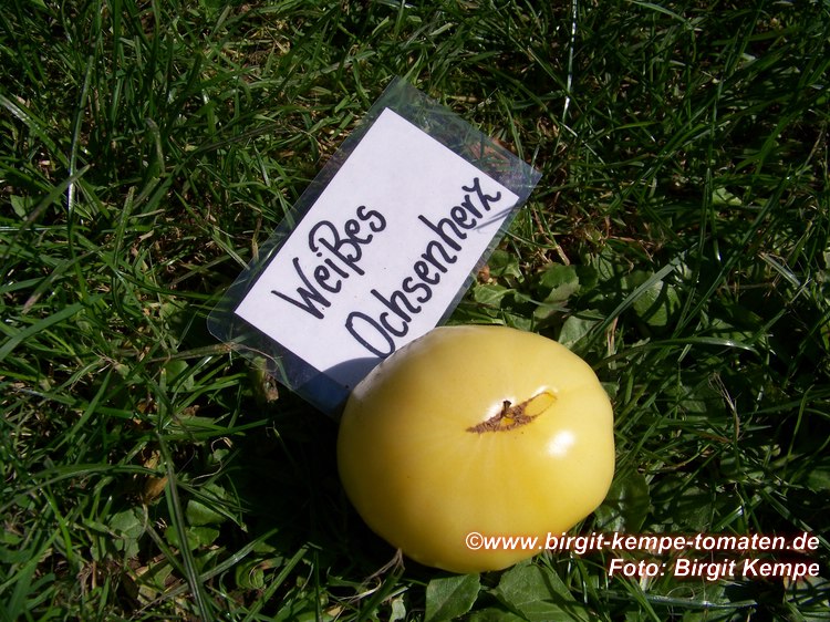 Weißes Ochsenherz - sehr große Pflanze (2 bis 2,5 m), kräftiger Wuchs extrem später Erntebeginn (Mitte September) geringer Ertrag riesengroße , herzförmige bis runde, weißlich-gelbe Früchte größte geerntete Frucht: 590 g mildwürziger, fruchtiger Tomatengeschmack, butterzart, saftig Leider hat die Kraut- und Braunfäule einen höheren Ertrag verhindert. (Quelle: www.schoenetomaten.de)