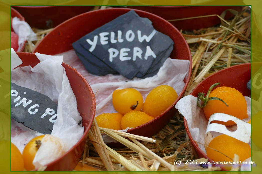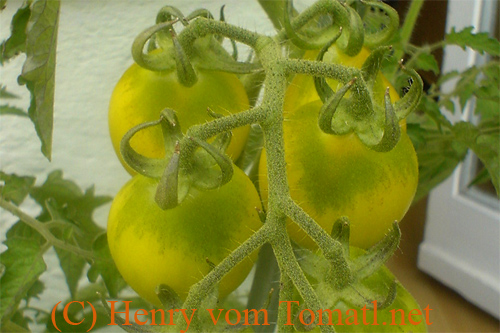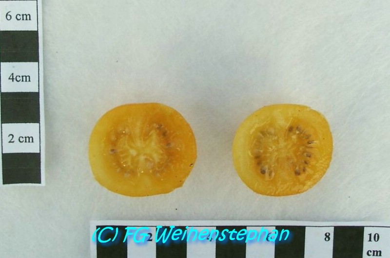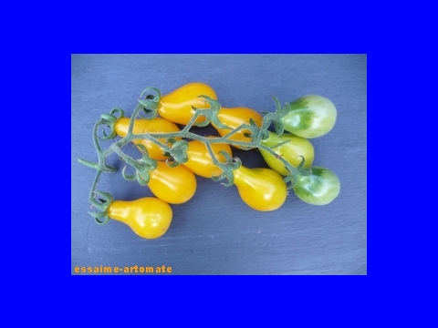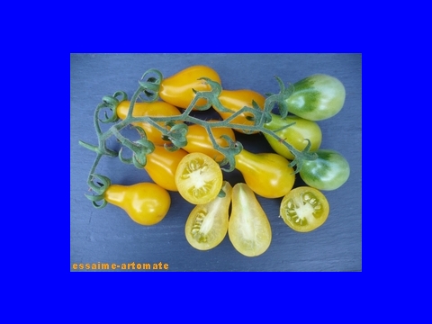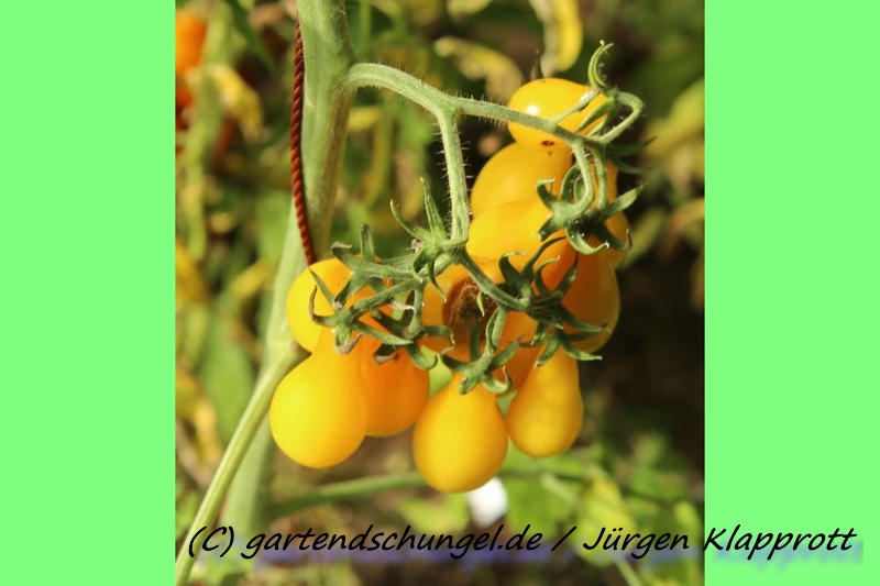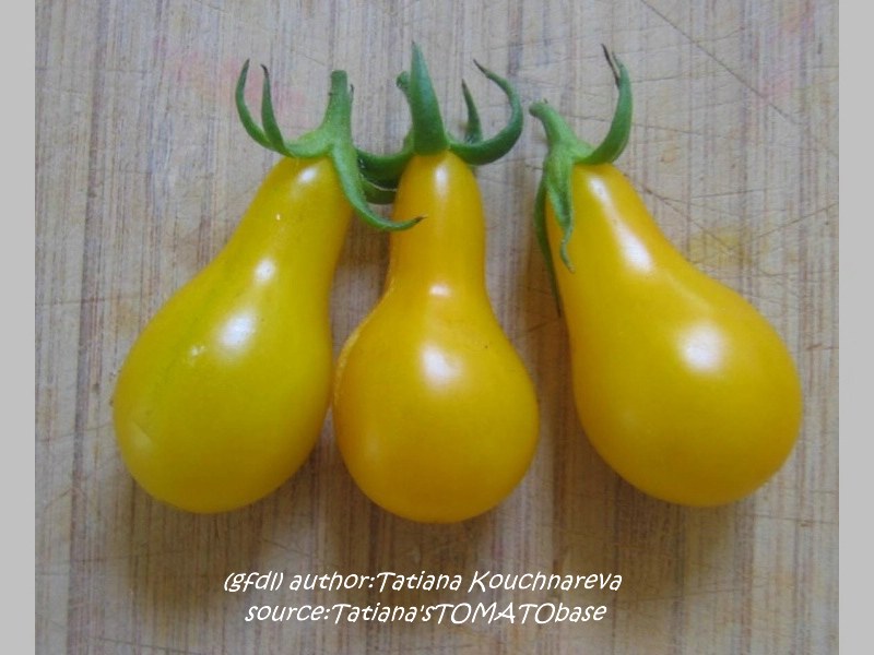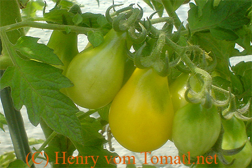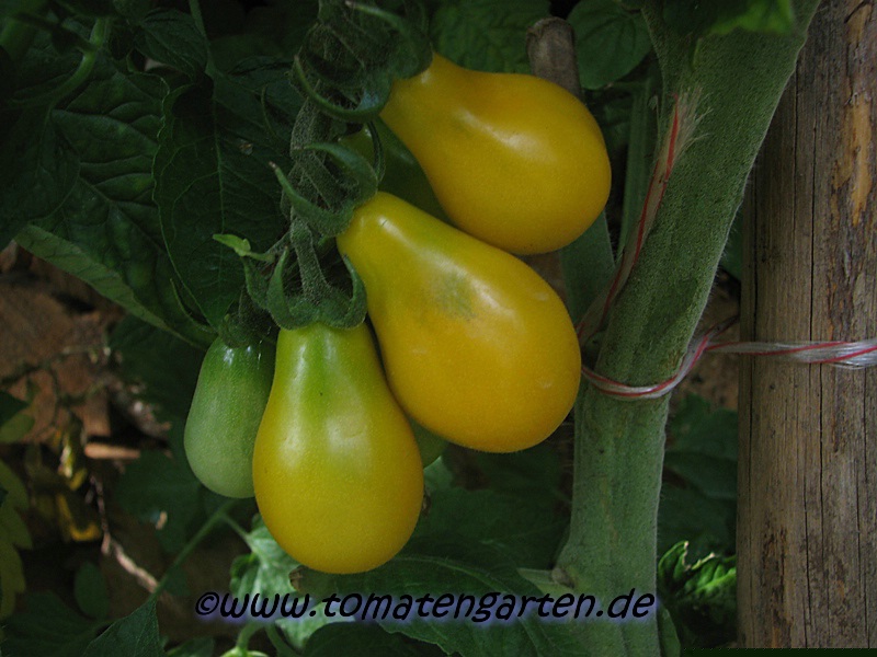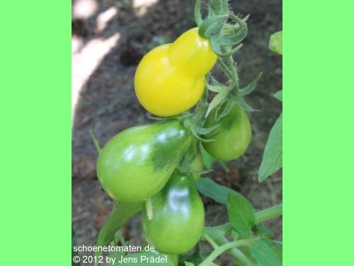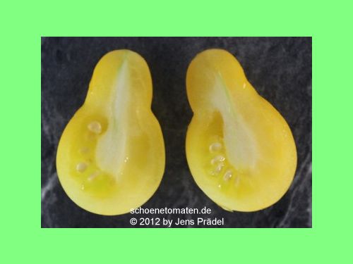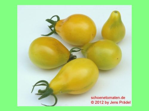 kleine (2,5 bis 3 cm breit und 4 bis 5 cm lang), birnenförmige oder tropfenförmige, gelbe Früchte
