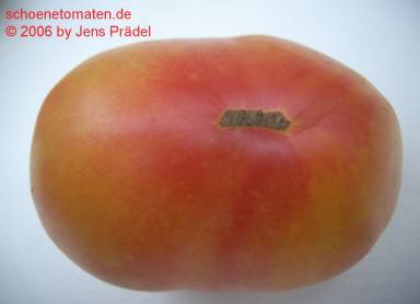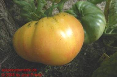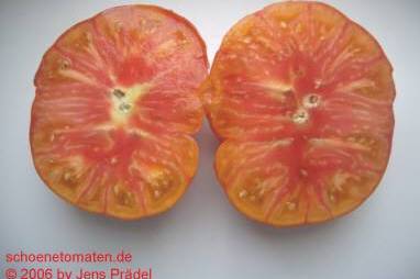 Yellow Red Stripes Inside - große Pflanze (1,5 bis 2 m) mittelfrüher Erntebeginn (Mitte August) sehr reich tragend sehr große, breitrunde, meist gerippte, orange-rote Früchte mit gelblicher Schulter und rotem Blütenpol Aufgeschnitten sehen die Früchte wie Blutorangen aus. größte geerntete Frucht: 645 g fruchtiger, sehr saftiger Geschmack, fast wie Obst eine sehr empfehlenswerte Sorte! (Quelle: www.schoenetomaten.de)