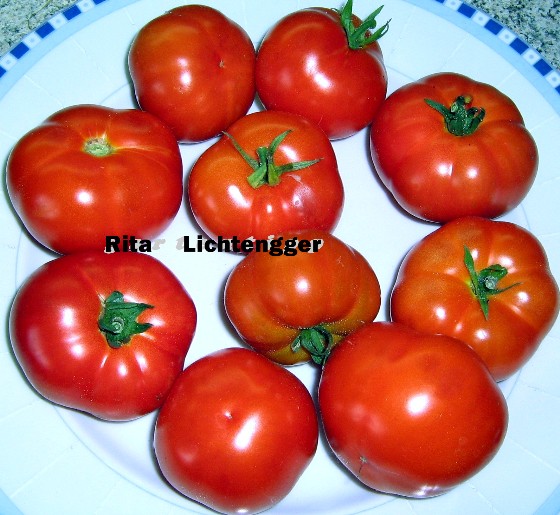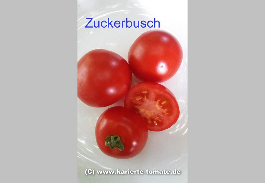 Zuckerbusch – leuchtend rote flachrunde große (ca. 5-6 cm) Früchte mit leicht süss/säuerlichem Geschmack; eine Buschtomate, die ca. 80cm hoch wird; hervorragend geeignet für Topfkultur; Reife ab Ende Juli. (Quelle: www.d-landsmann.de / Mit freundlicher Genehmigung des Autors)