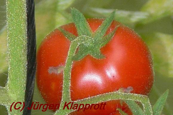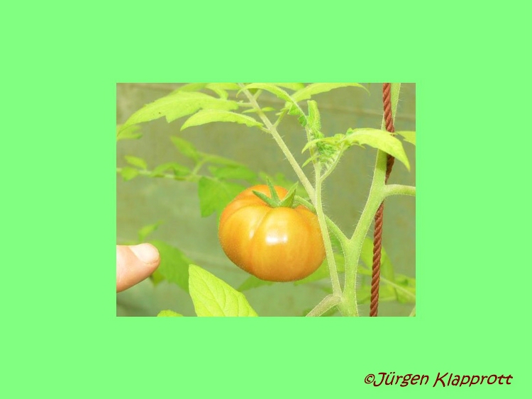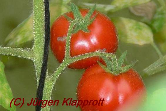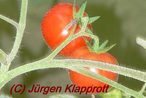 Pfl. ca. 1m hoch. Wiederum keine Kirschtomate, sondern Mini-Fleischtomate mit weichen harthäutigen Früchten, die sehr gut schmecken. Ernte etwa Mitte September. zitat:j.klapprott